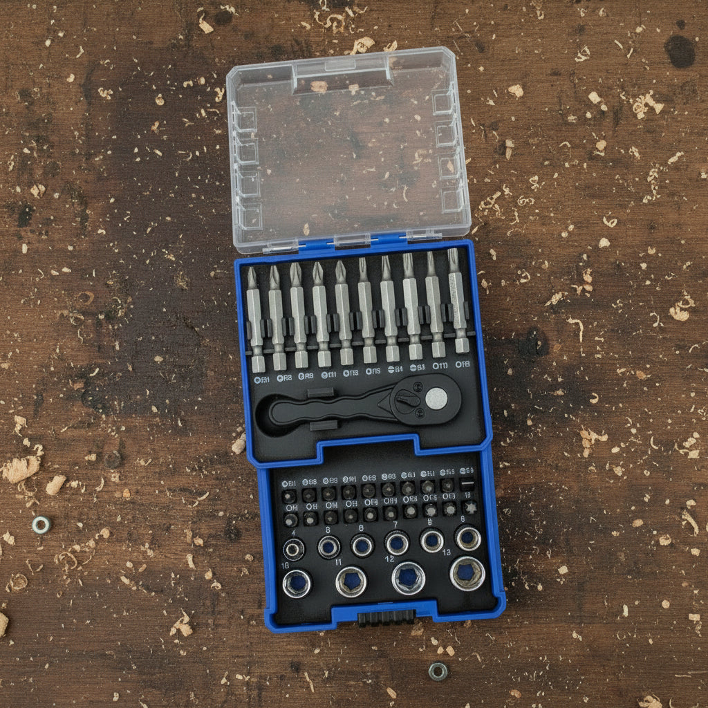 Supplied in a sturdy fold away plastic case with markings for easy socket and bit selection.