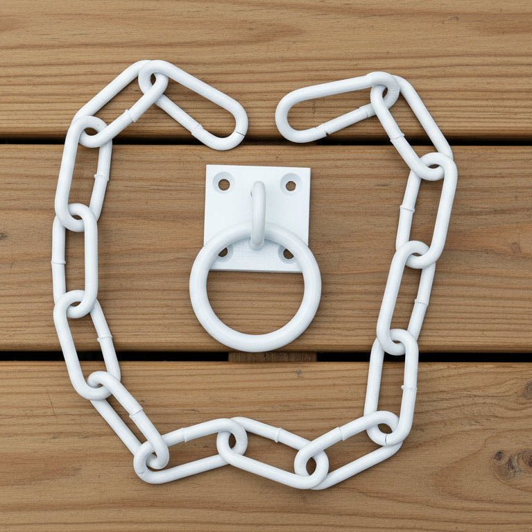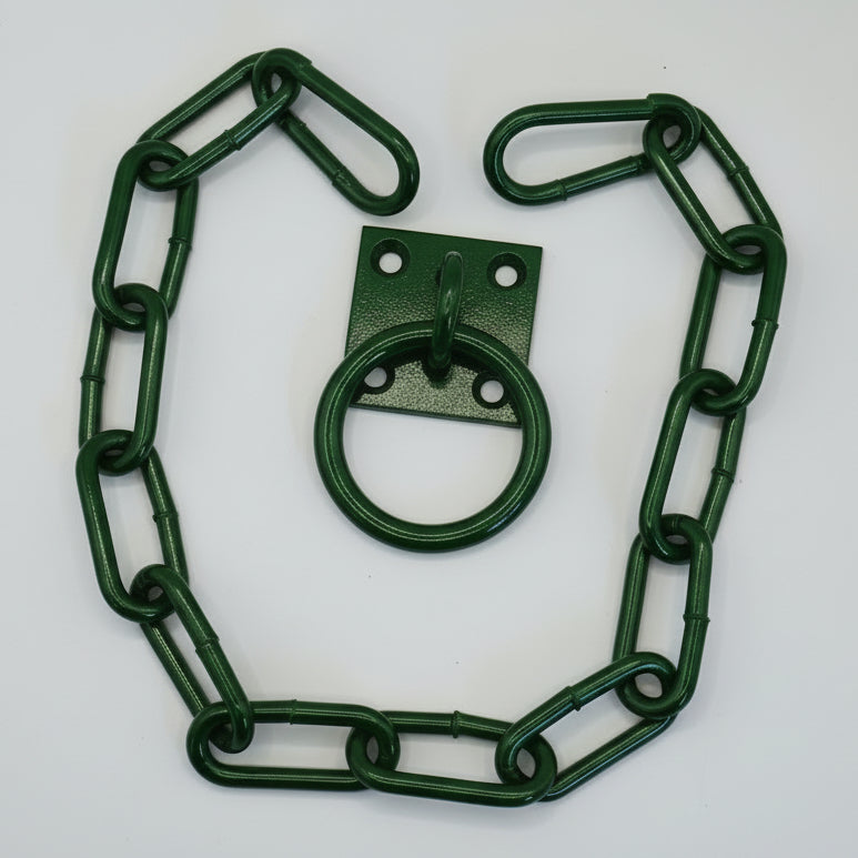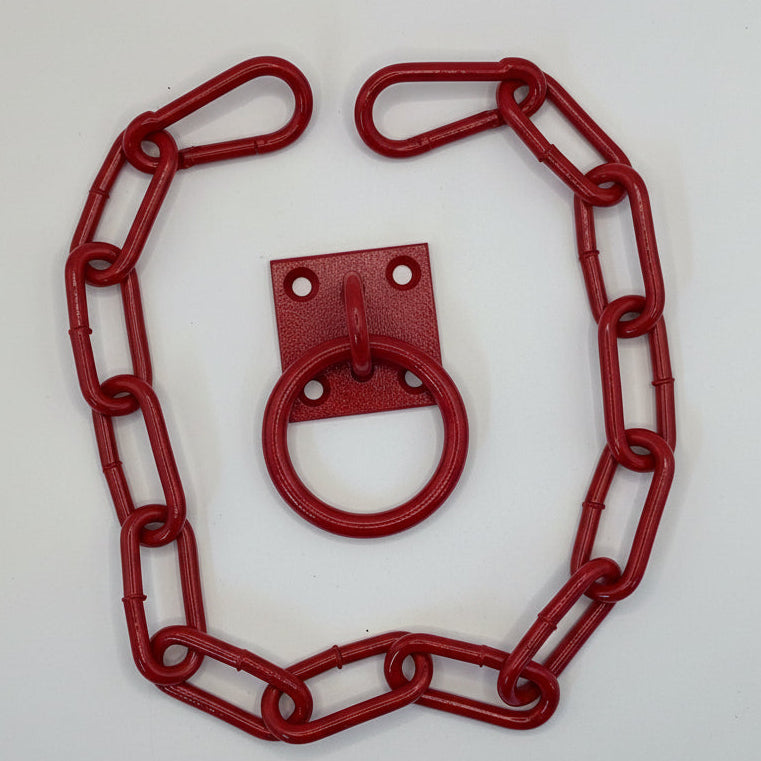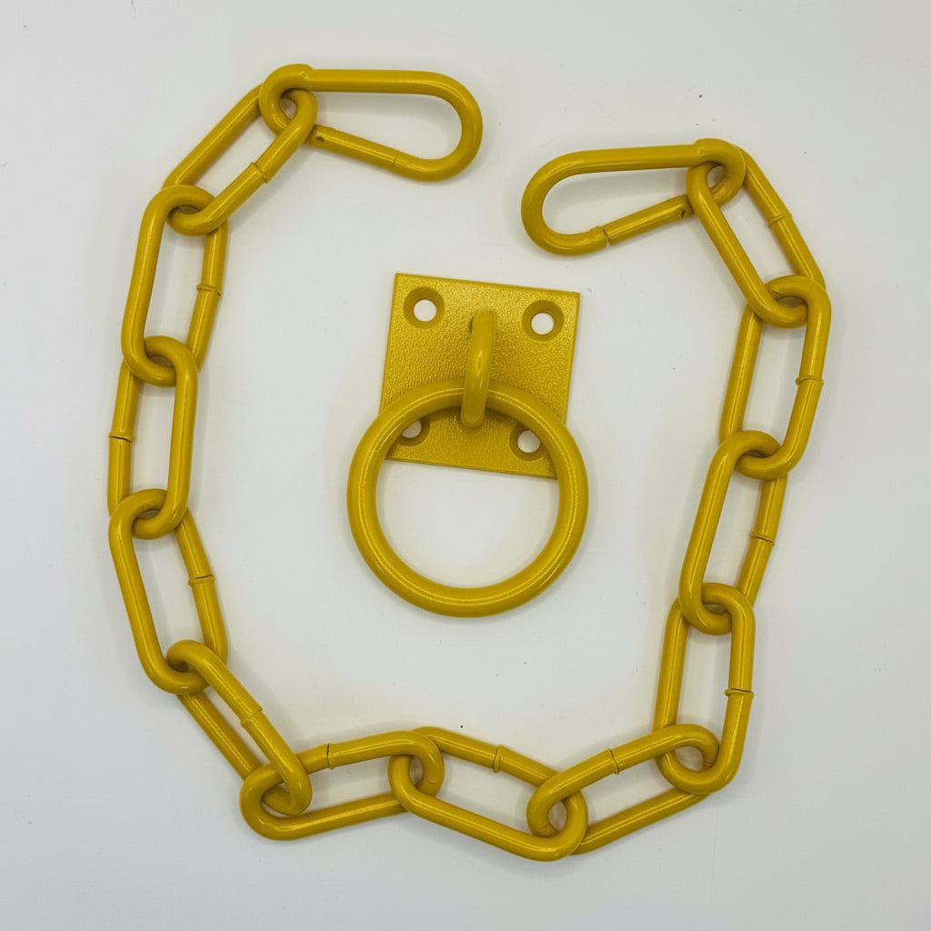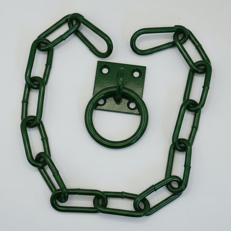 Attach the "Ring on Plate" to a suitable secure surface, loop the chain around the wheelie bin hinge handle, through the ring and secure with the carbine hooks.